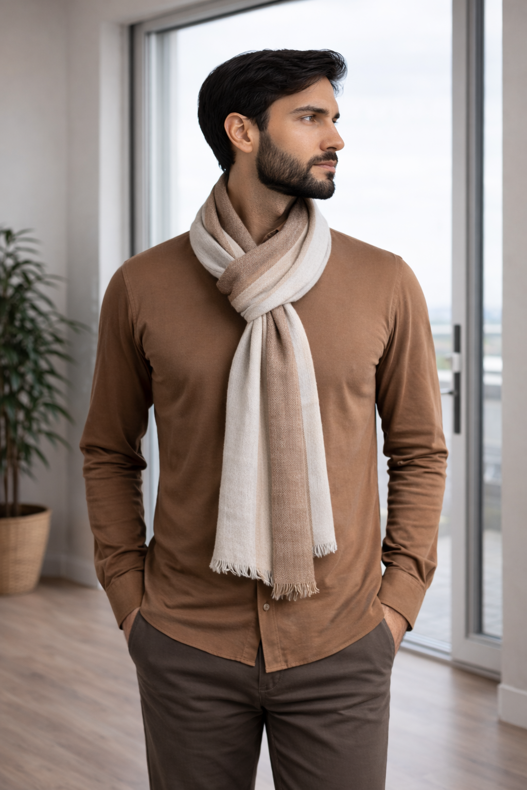 A refined, lightweight scarf designed for effortless elegance and year-round wear. Its soft texture and balanced neutral tones make it a versatile essential for both casual and smart looks.