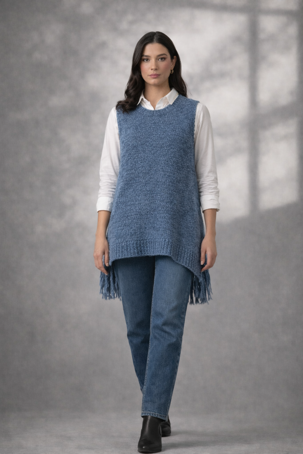 The Ada Alpaca Vest offers a soft, luxurious feel with a beautifully textured knit that adds depth to any outfit. Its relaxed, layered silhouette pairs effortlessly with shirts and denim for a modern, cozy look. Side tassel details bring movement and a handcrafted touch. A perfect piece for elevating cool-weather layering.