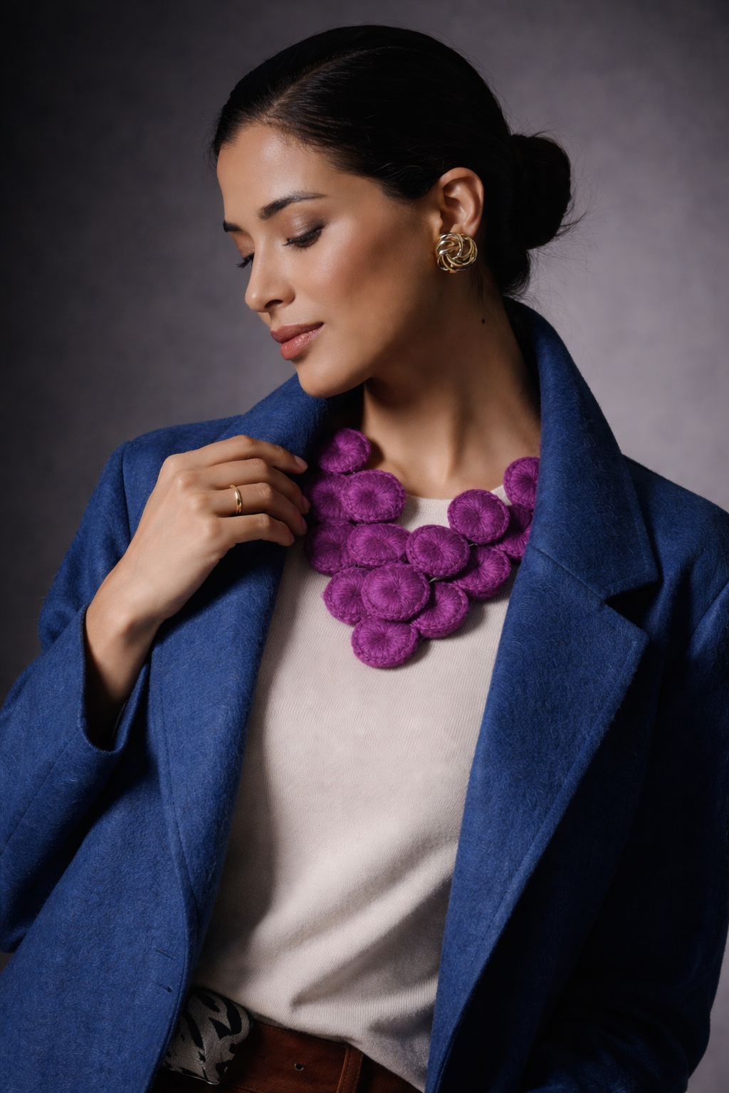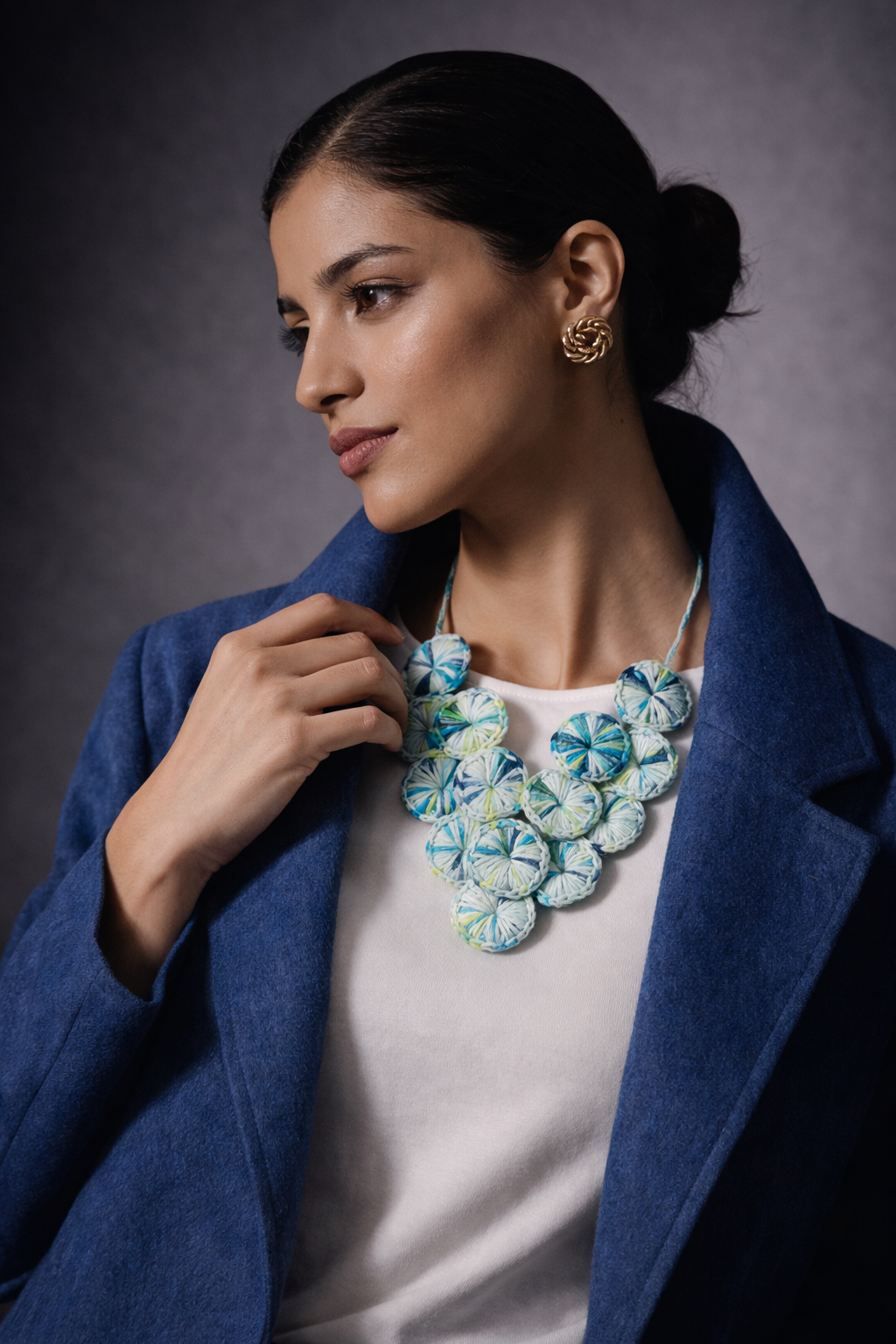 Organic Cotton necklace with knitted discs in a grapevine shape. A sustainable piece that adds color and style to any outfit
